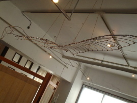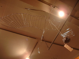 天井から吊るしているいわゆる「モビール」?でしょうか・・・。 ワイヤーをひっぱるとゆっくり、優雅に(笑)羽根が動いて 飛んでいるような動きをします。男性に人気があったのが意外でした。 素材はオールステンレス。 羽根の全長は80cmくらい。 |
