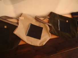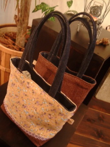 | デニムとコーデュロイのミニトート。 茶色とベージュで温かさを出してみました。 |