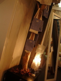 巾着やタブリエは天板がすりガラス状なテーブルに ディスプレイ。↓ |