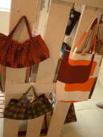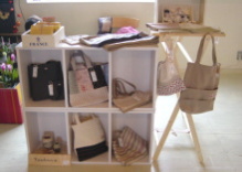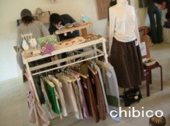 | ボディも使われた立体的なディスプレイが 印象的だったchibicoさん。 洋服からタブリエ、バックなどの生活布雑貨も たくさんの品揃え。 白い什器も、もちろんご自身の手作りです。 |
