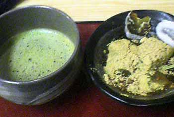 おやつはお抹茶&わらび餅。んまかったv わらび餅の上にあるのは干し柿。